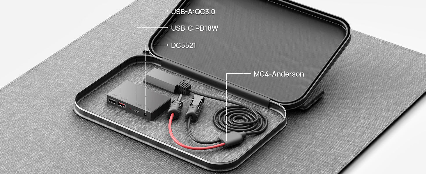 AFERIY S200 folding portable solar PV panel 200W has 2 USB A, 1 USB C, 1 DC5521 and 1 MC4-Anderson output interface. The AFERIY S200 can be used with a portable power station to convert solar energy into electrical energy and store it in a portable power station. It can quickly power devices such as your electric car, camping refrigerator, mobile phone and laptop.