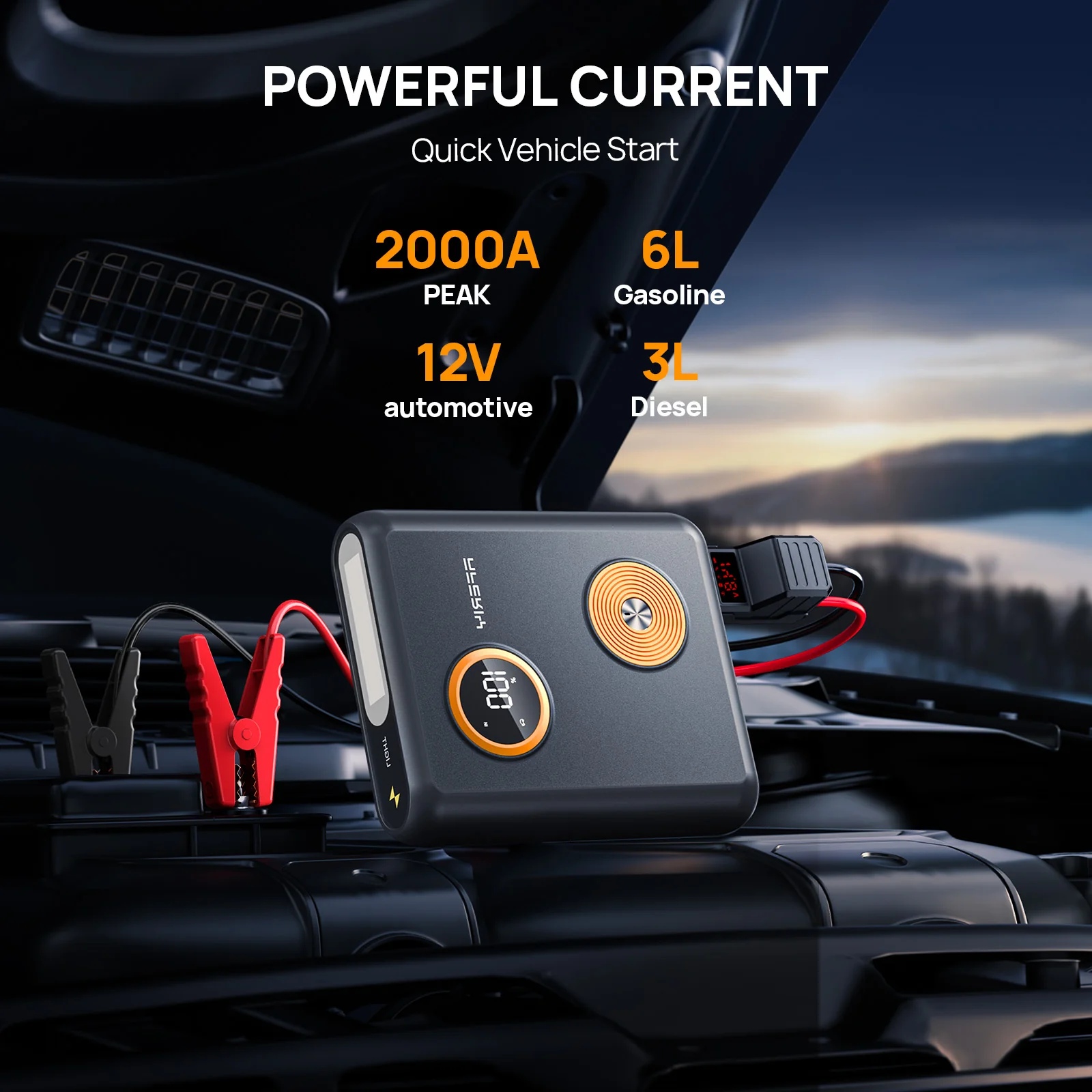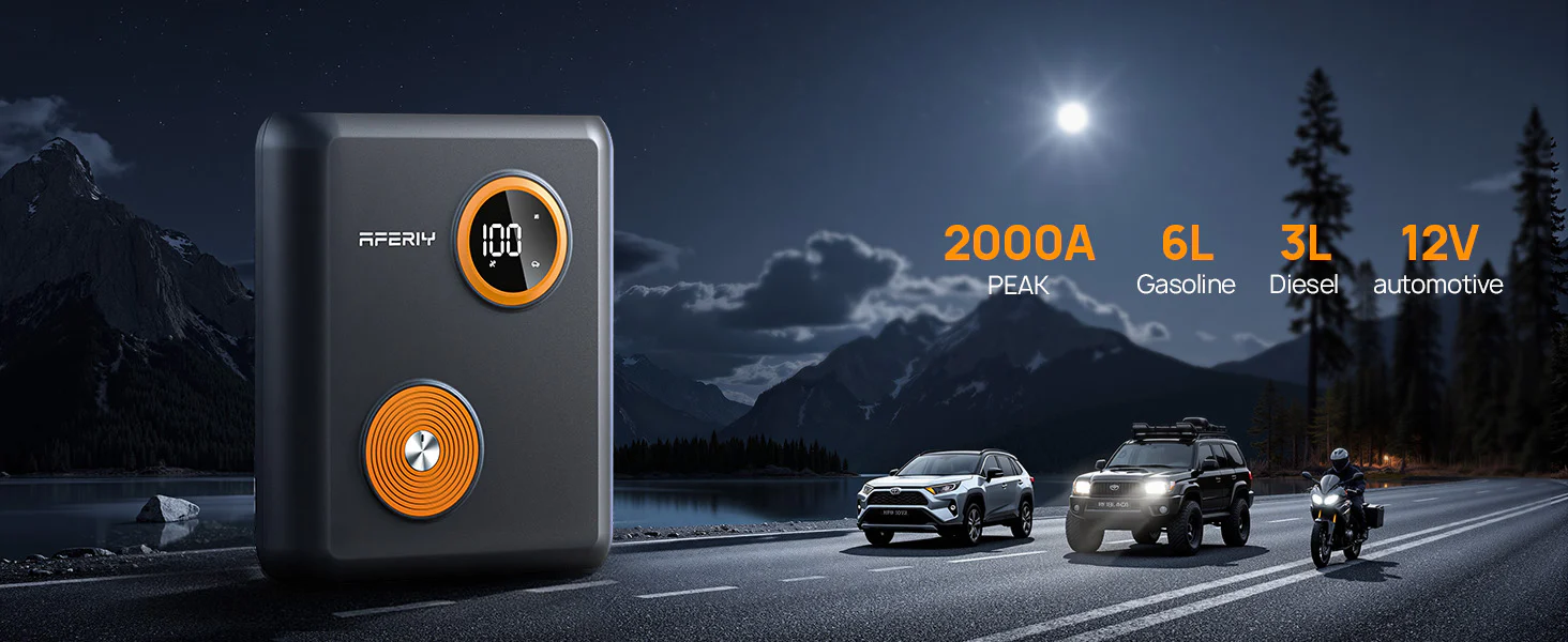 The AFERIY 12V car jump starter delivers a peak current of 2000A, easily starting engines up to 6.0L gasoline or 3.0L diesel. Compatible with all 12V vehicles: cars, SUVs, motorcycles, RVs, and light trucks.