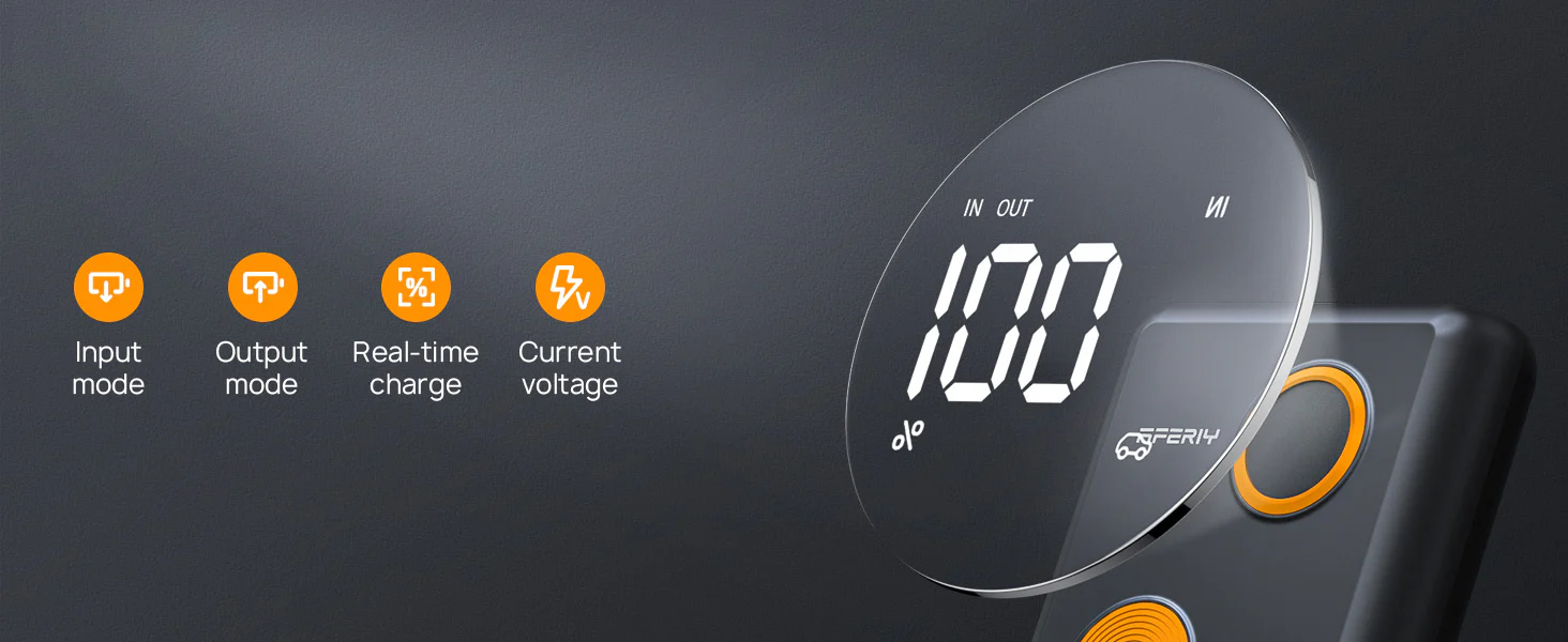 The AFERIY 12V car jump starter combines multiple functions — emergency start, DC output, fast USB QC3.0 charging, and a 3-in-1 LED light (lighting, flash, SOS) — all complemented by a high-definition smart LED screen that displays real-time input power, output mode, voltage, and battery status.