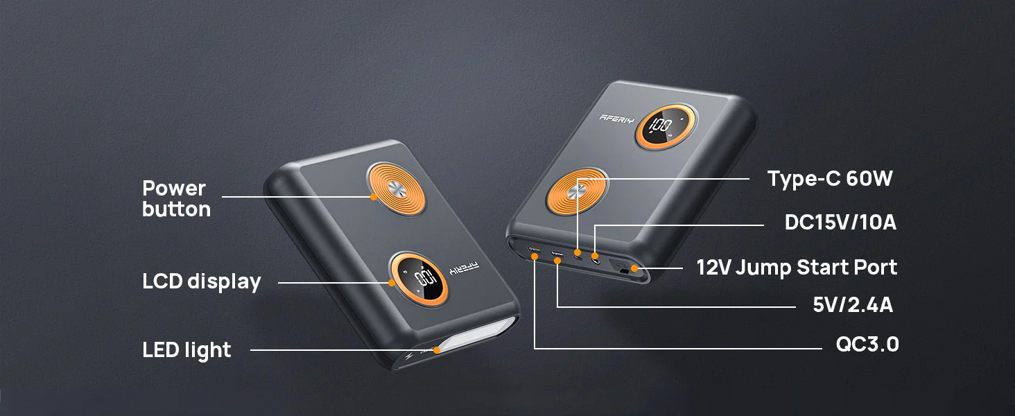 With 2 USB ports (QC3.0 + 5V/2.4A) and a DC output (15V/10A), the AFERIY jump starter allows you to charge multiple devices simultaneously or power your outdoor equipment.