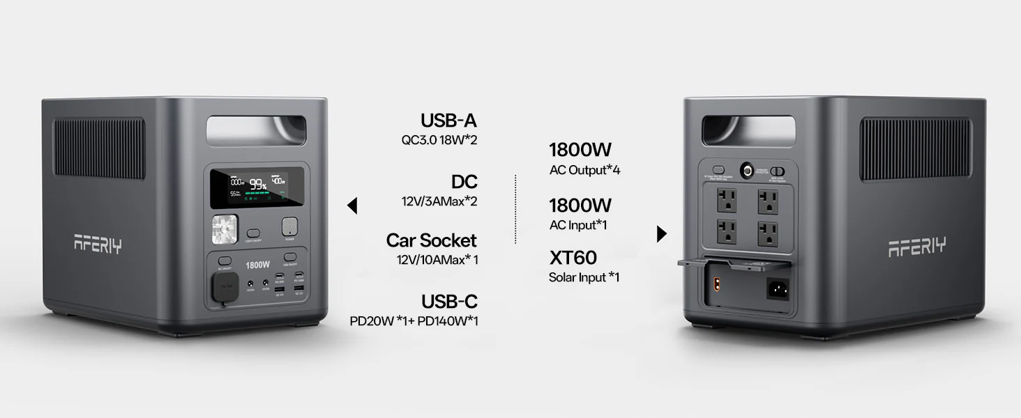 AFERIY P180 features a comprehensive set of outputs to cover home, office, and outdoor needs: 4× AC outlets, 1× 12V/10A cigarette lighter port, 2× 12V/3A DC5521 ports, 2× 18W QC3.0 USB-A ports, 1× 20W PD Type-C port, 1× 140W PD Type-C port, 1x 1800W input port, 1x XT60 input port, and a built-in 1W LED light. Power multiple household appliances, laptops, phones, and outdoor devices at the same time with stable and reliable energy.