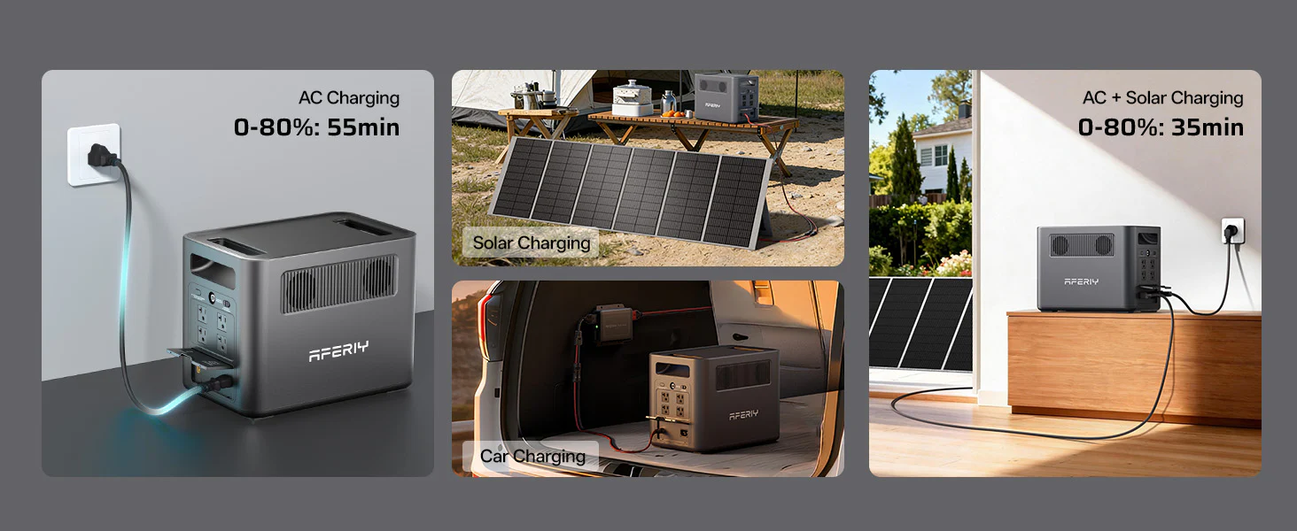 Support for wall charging, car charging, and solar charging adds flexibility.