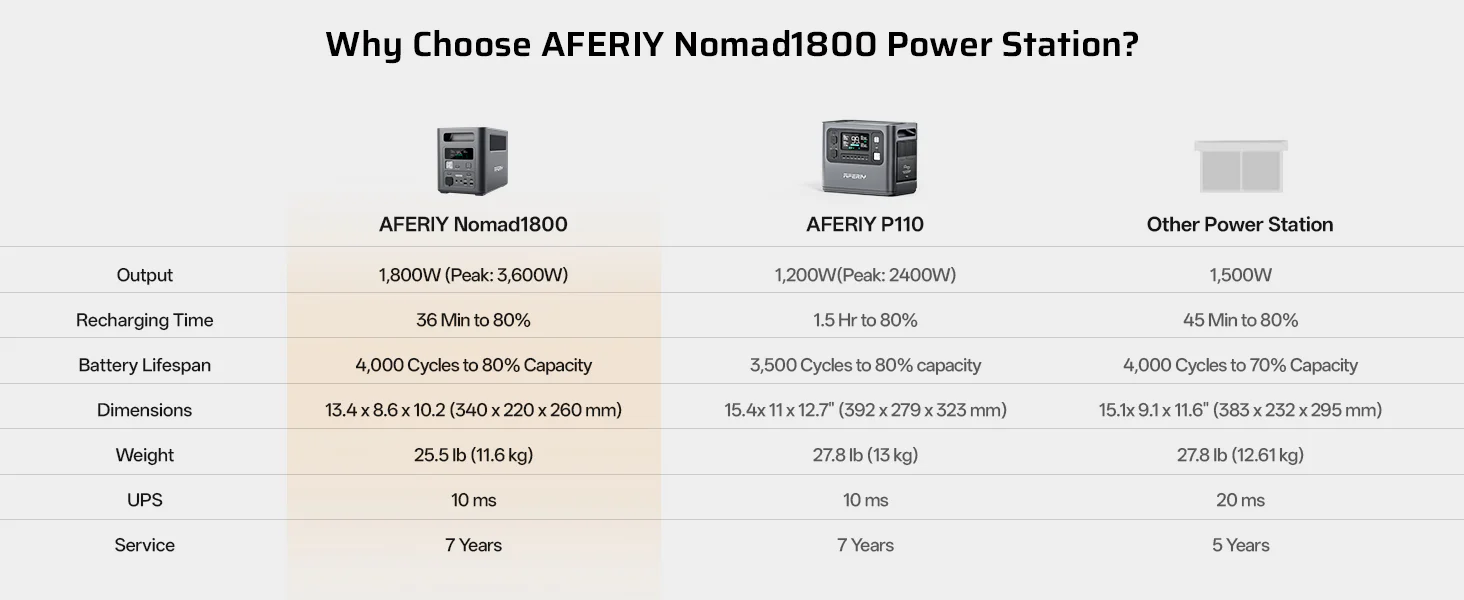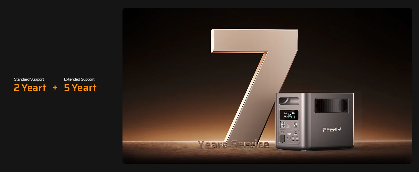 Invest in power that lasts. The AFERIY Nomad1800 is backed by a 7-year extended manufacturer’s warranty and comprehensive lifetime technical support. We are committed to providing you with a worry-free energy experience from the day of purchase, ensuring your backup power is always ready when you need it most.