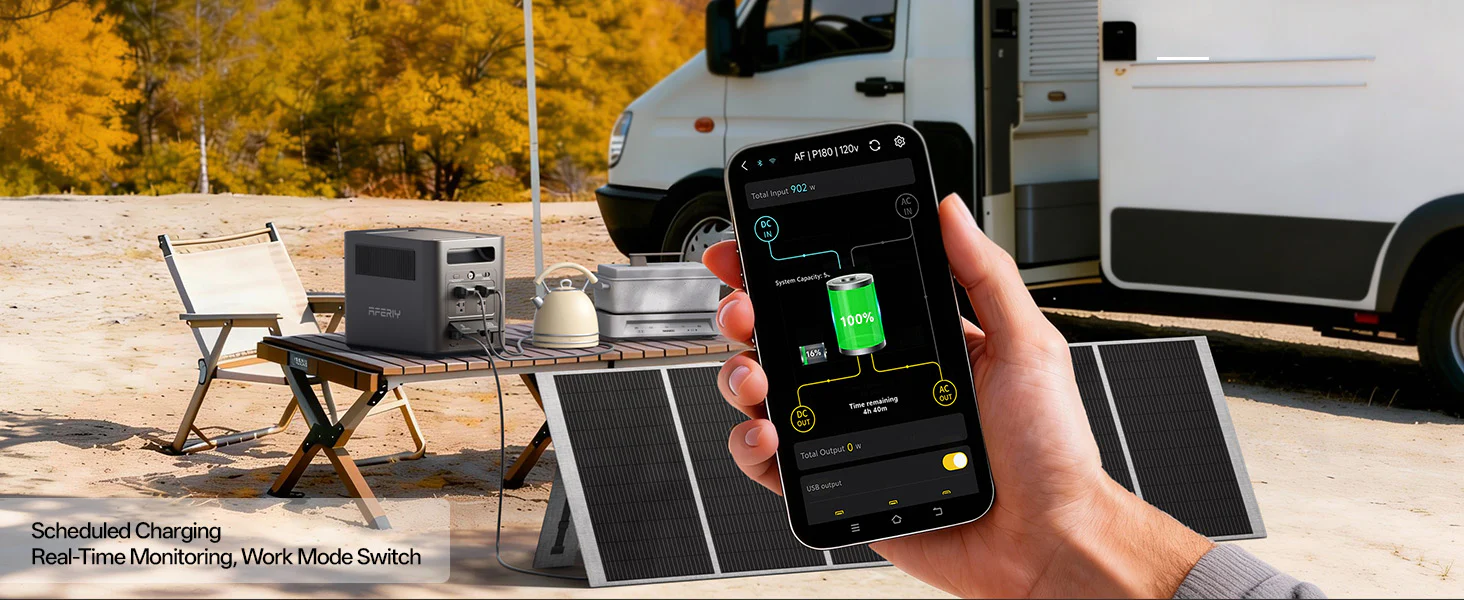 Monitor battery level, input/output power, and operating modes remotely via the AFERIY App. Weighing only 11.64 kg, the AFERIY P180 is the lightest 1024Wh portable power station in the AFERIY lineup, delivering full 1kWh capacity in a compact 350 × 220 × 263 mm body—easy to carry for camping, travel, and emergency backup.s.
