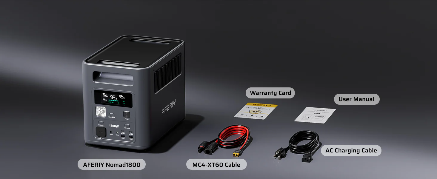 The AFERIY Nomad1800 comes with a complete set of high-quality cables for both AC and solar charging, allowing you to power up immediately. Whether you’re preparing for a blackout or heading off-grid, we’ve got you covered.
