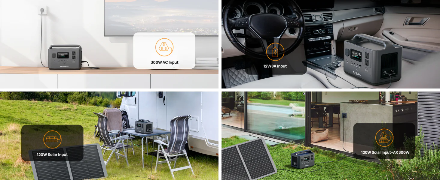 Recharge via: ① Wall outlet (up to 300W, full charge in 1.2h), ② Solar panel (up to 120W), ③ Car outlet (12V/8A), ④ AC + Solar dual input for faster charging.