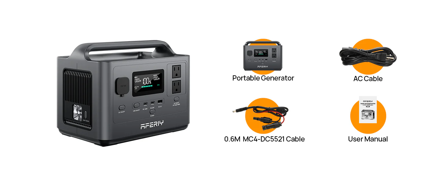 1 × AFERIY P040 Portable Power Station (400W, 256Wh), 1 × AC Charging Cable, 1 × MC4 to DC5521 Solar Cable, 1 × User Manual — ready to use out of the box.