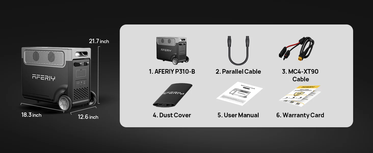 Comes with a 7-year extended manufacturer’s warranty and lifetime technical support from the date of purchase. The package contains an AF-P310 portable power supply, AC charging cable, MC4-XT90 cable, instruction manual, dust cover, and storage bag.