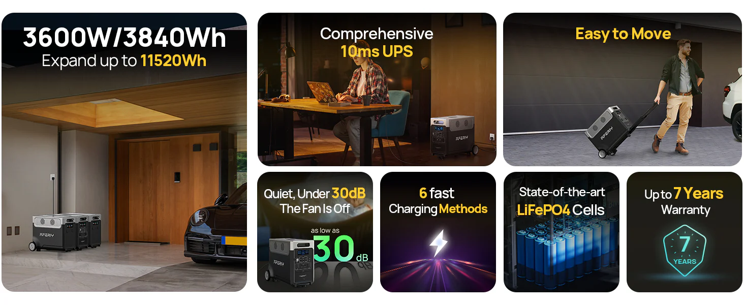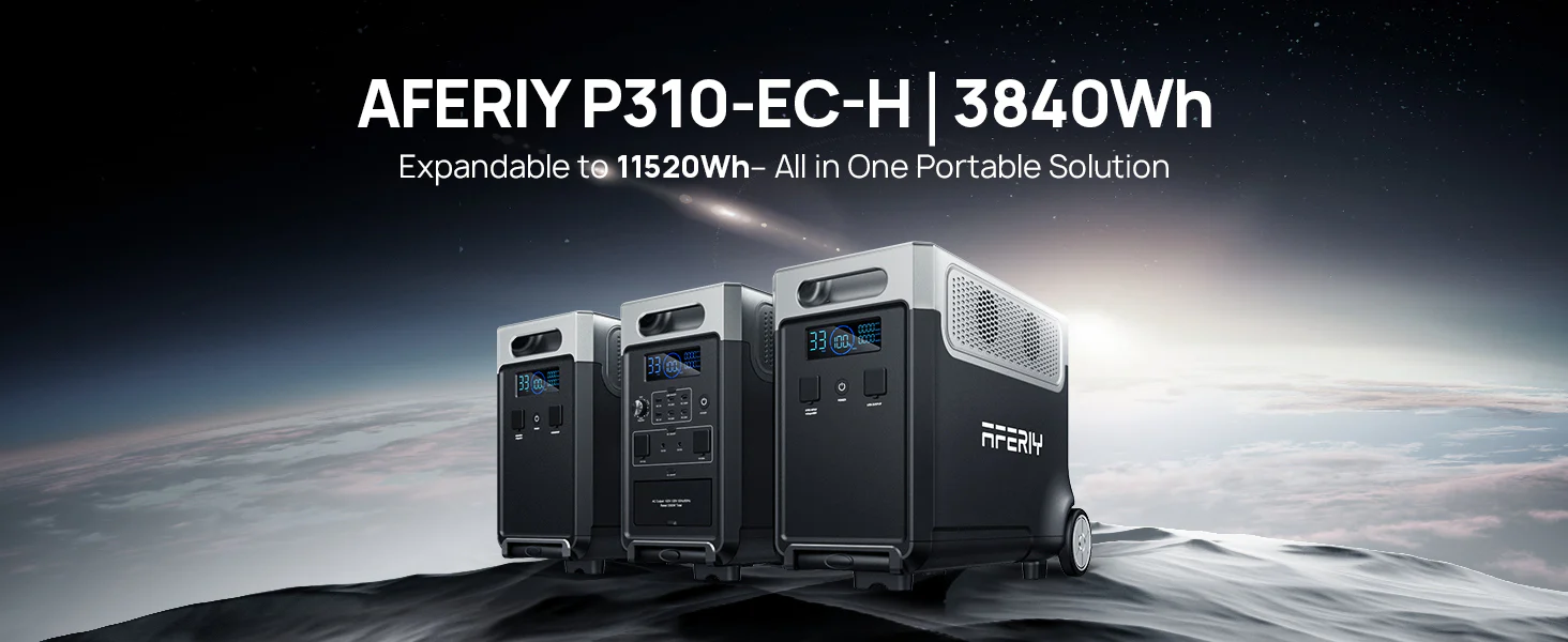 AFERIY P310-EC portable power station supports battery expansion from 3840Wh to 11520Wh, providing reliable energy for both home backup and outdoor adventures.
