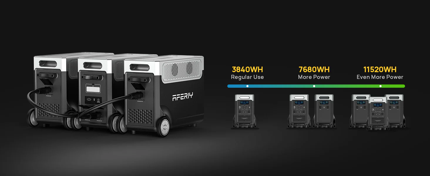 AFERIY P310-EC portable power station supports battery expansion from 3840Wh to 11520Wh, providing reliable energy for both home backup and outdoor adventures.