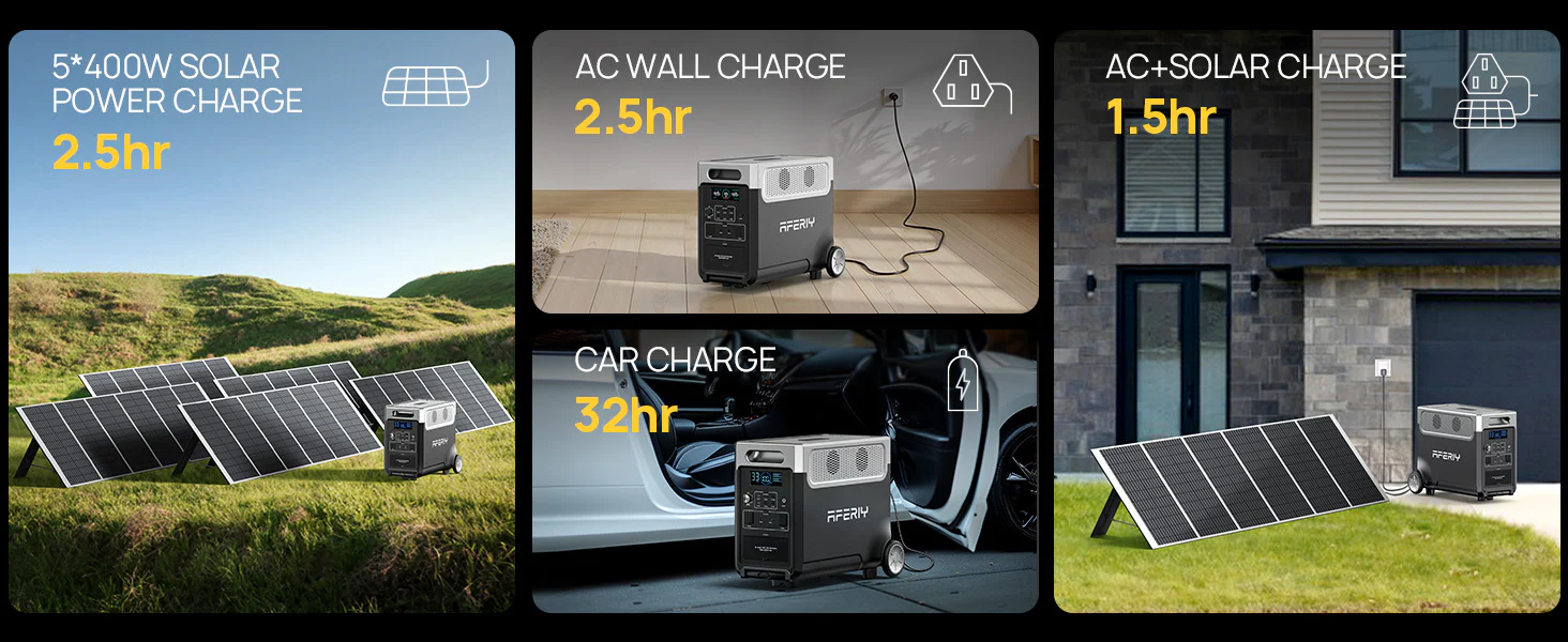 The AFERIY P310 3600W portable power stations support 4 recharging ways. It can be charged simultaneously via an AC outlet and a solar panel, fast charging from 0% to 99% in 1.5 hours. It supports solar charging, and it can be fully recharged within 2.5 hours via a 1500W solar panel, or via a 120W car outlet in 32 hours.