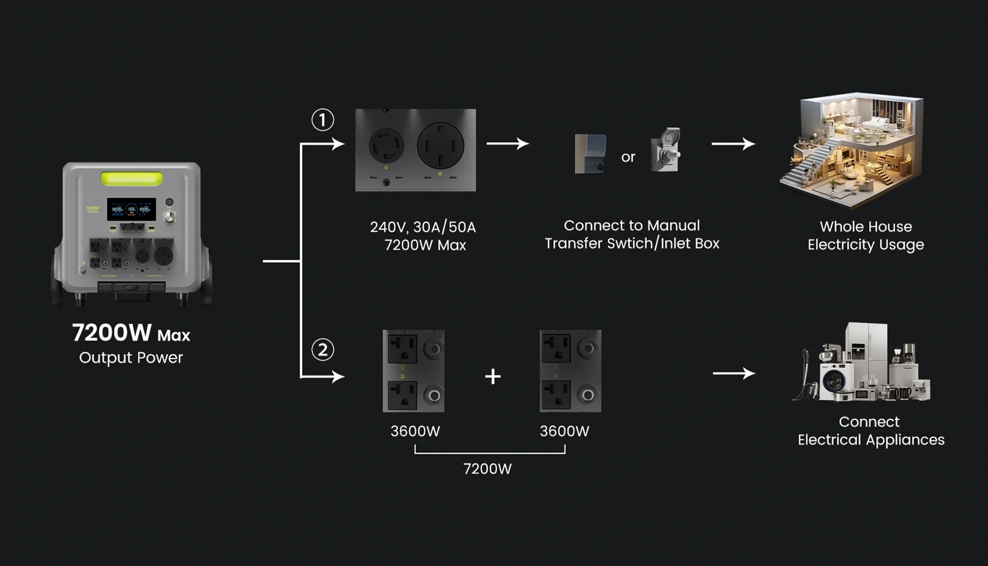| AC Outlet | 6*AC (7200W Max, 9000W Surge) |