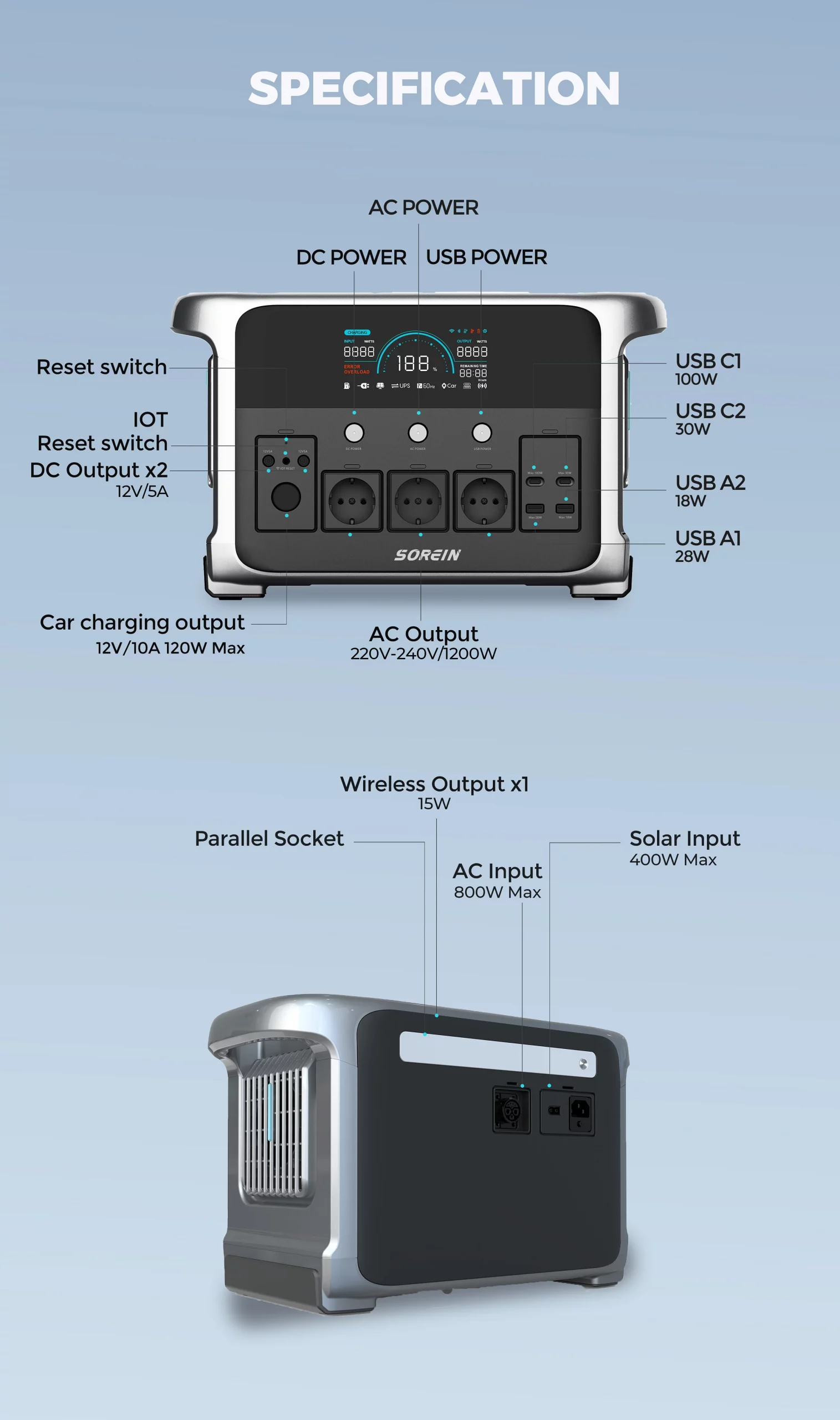| DC OULETS (×2) | One Port 12V/5A (Cigarette Lighter Port + DC 5521 x 2 0utput at the same time 120W Max) |